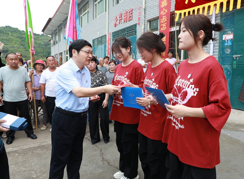 校长李学志为三胞胎姐妹颁发录取通知书和慰问金