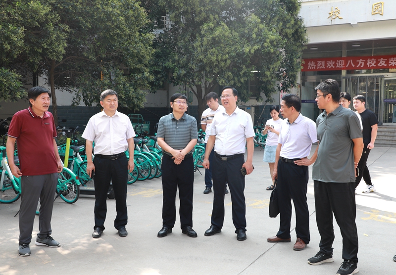 李学志一行先后来到教室、餐厅、学生公寓、校医院、学术交流中心、学生浴室、在建维修项目工地、部分二级学院等场所,详细了解各单位暑期工作开展情况和开学筹备事宜,重点就学习环境、宿舍生活环境、暑期改造工程进展、后勤保障服务、校园安全保卫等情况进行检查督导,并对检查中发现的问题提出整改要求,现场进行协调解决。