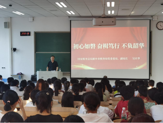 吴庆华校友现任国家税务总局新乡市税务局党委委员、副局长,他饱含对母校和学弟学妹深深的爱,以“初心如磐、奋楫笃行、不负韶华”为题,结合自己的学习工作经历,向同学们分享了自己的人生感悟,鼓励大家做好自己的学业和职业规划,牢记求学问道、报效祖国的初心,勤于实践、修炼品行、持之以恒、勇毅前行,为中华民族伟大复兴做出自己应有的贡献。吴庆华校友的报告站位高远、内容丰富、言语幽默,博得了满堂喝彩。
