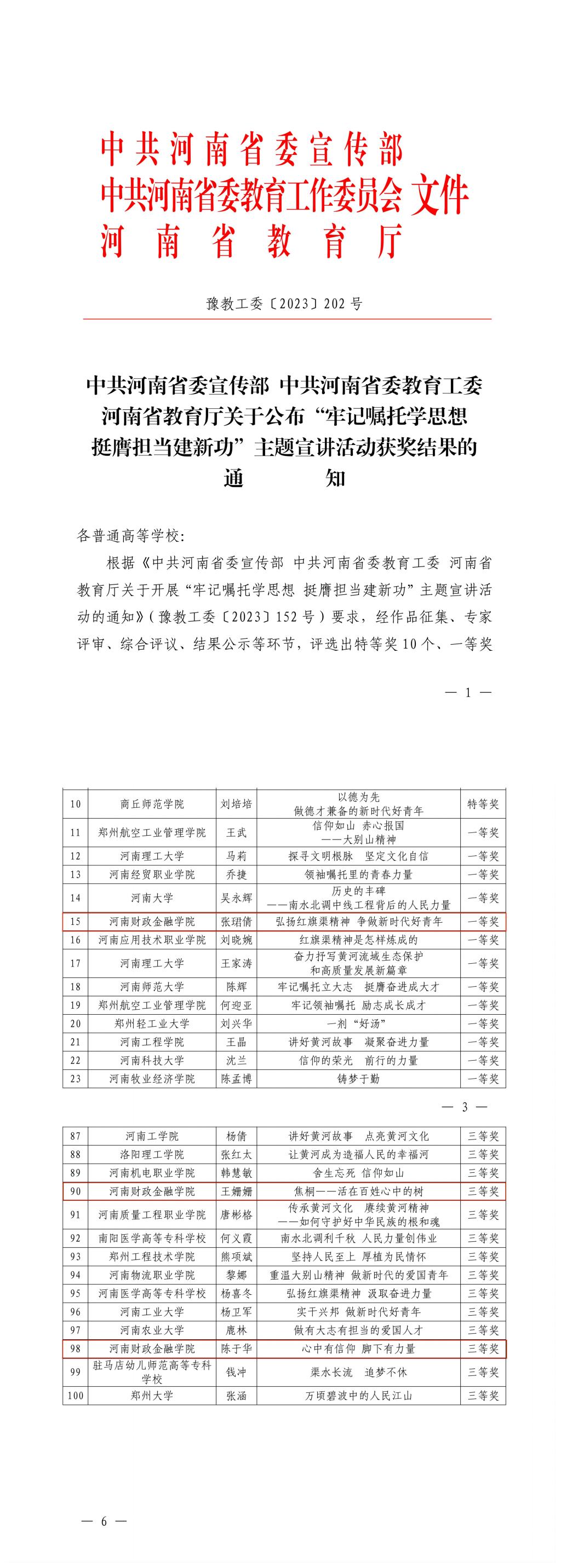 近日,中共河南省委宣传部、中共河南省委教育工委、河南省教育厅下发了《关于公布“牢记嘱托学思想 挺膺担当建新功”主题宣讲活动获奖结果的通知》(豫教工委〔2023〕202号),球友会官方网站多位教师获奖。