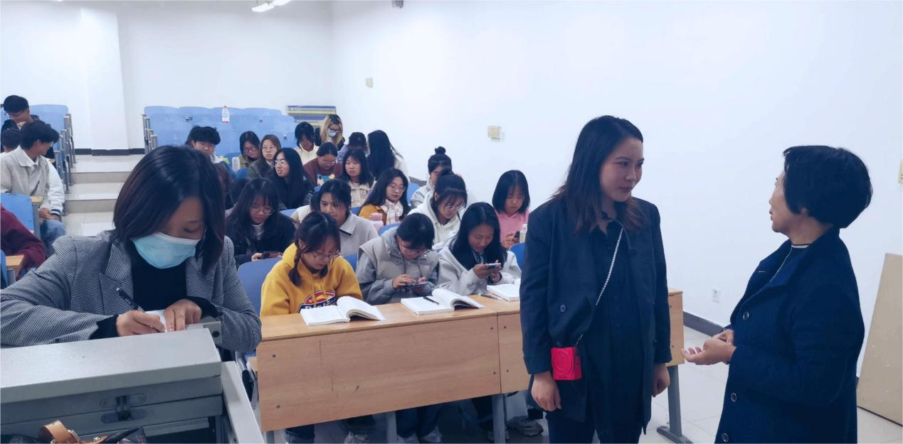 调研组采取随机抽取、随手推门的方式,随堂听取了马克思主义学院张孟芳老师讲授的《习近平新时代中国特色社会主义思想概论》课程和秦江老师讲授的《思想道德与法治》课程,随机发放并现场收集了调研问卷。调研组对2位教师的教学水平和课堂效果表示充分肯定,并就课堂教学导入、教学方法运用和融入“习近平文化思想”最新精神等与授课教师进行了现场指导和交流。