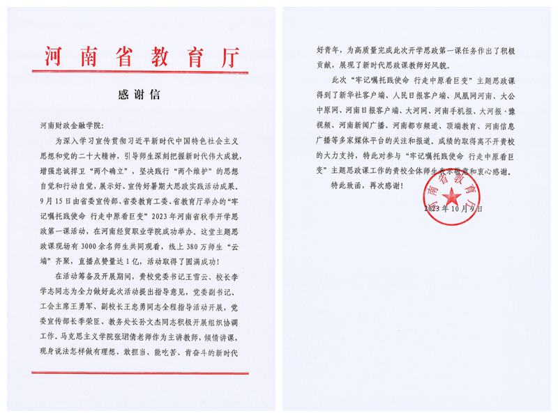 信中指出,9月15日,由省委宣传部、省委教育工委、省教育厅举办的“牢记嘱托践使命 行走中原看巨变”2023年河南省秋季开学思政第一课活动成功举办。这堂主题思政课现场有3000余名师生共同观看,线上380万师生“云端”齐聚,直播点赞量达1亿,活动取得了圆满成功!在活动筹备及开展期间,校党委书记王雪云、校长李学志为全力做好此次活动提出指导意见,党委副书记、工会主席王勇军、副校长王忠勇全程指导活动开展,党委宣传部部长季荣臣、教务处处长孙文杰积极开展组织协调工作。活动中球友会官方网站派出河南省高校思政课名师工作室(球友会官方网站)主持人张珺倩老师参与主讲《寻路·大别山》,张珺倩老师工作中业务能力扎实,态度严谨认真,过程精益求精,为开学第一课的成功举办贡献了力量。