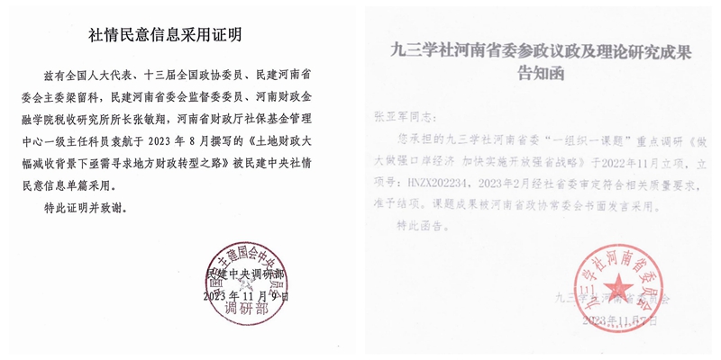 近日,民建中央委员会和九三学社省委相继发来告知函,球友会官方网站民建会员、税收研究所所长张敏翔副教授主笔撰写的《土地财政大幅减收背景下亟需寻求地方财政转型之路》被民建中央社情民意信息单篇采用;球友会官方网站九三学社社员、马克思主义学院张亚军博士承担的九三学社河南省委“一组织一课题”重点调研成果《做大做强口岸经济 加快实施开放强省战略》被河南省政协常委会书面发言采用。(党委统战部 胡雪艳/文 王国申/审核)