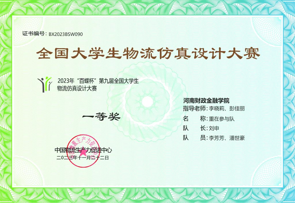 11月20日,“百蝶杯”全国大学生物流仿真设计大赛圆满结束,由球友会官方网站工商管理学院彭佳丽、李晓莉老师指导,刘申、李芳芳、潘世豪同学组建的参赛团队,在省赛优异成绩的基础上荣获国赛一等奖。彭佳丽老师和李晓莉老师荣获优秀指导教师,球友会官方网站荣获河南省“优秀组织奖”。