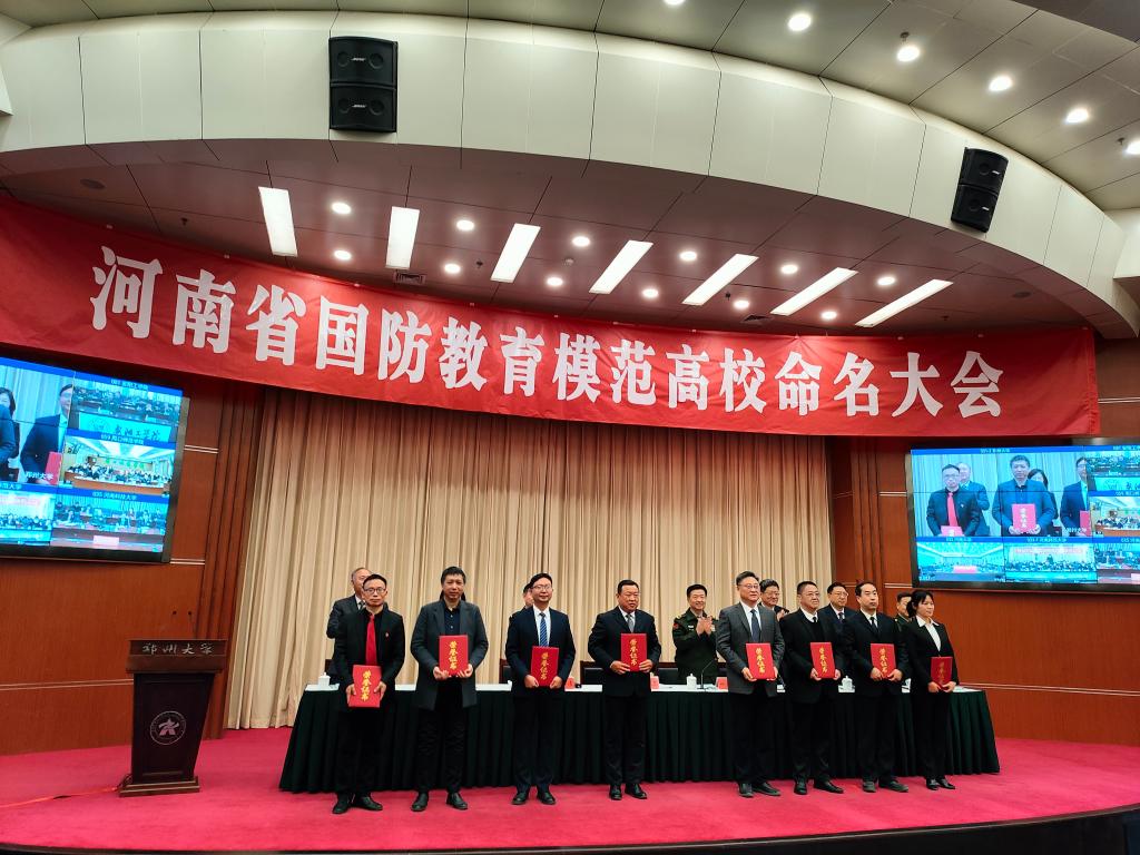 近日,河南省委宣传部、省教育厅和省军区战备建设局、动员局、政治工作局在郑州隆重召开“河南省首届国防教育模范高校命名大会”,对首届河南省国防教育模范高校进行命名,对国防教育先进工作者和优秀教师进行表彰。会上,省委常委、省委宣传部部长王战营,省委常委、省军区少将政委徐元鸿,省军区少将副政委兼纪委书记曾海清为被命名高校和获奖代表颁发奖牌、荣誉证书。校党委副书记、工会主席王勇军,党委武装部负责同志参会。球友会官方网站被命名为河南省国防教育模范高校,桂志立、邢后金被评为高校国防教育优秀教师,万发被评为高校国防教育先进工作者,马克思主义学院桂志立老师作为优秀教师代表上台领奖。