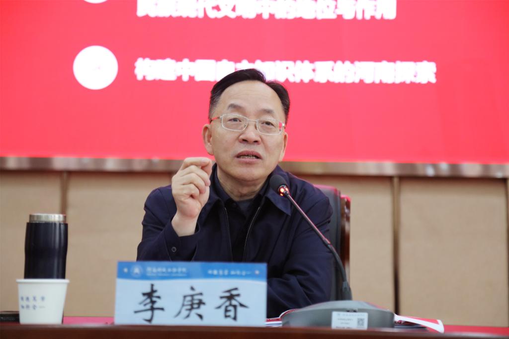 李庚香以《深入学习贯彻习近平文化思想 建设中华民族现代文明——以习近平文化思想指导中华民族现代文明建设》为题,从习近平文化思想的提出与“两个结合”的重大意义,从唯物史观、大历史观看待中华优秀传统文化、中华民族现代文明、人类文明新形态,中原地区文明化进程与新文旅,构建中国自主知识体系的河南探索四个方面,深刻阐释了习近平文化思想的提出过程、主要内容、历史地位与伟大意义,剖析了中华优秀传统文化、中华民族现代文明、人类文明新形态,中原地区文明化的发展脉络、历史逻辑和内涵特征,以及在中华民族现代文明建设中中原何为的时代课题。他指出,“两个结合”表征新时代马克思主义中国化时代化进入新境界,是中华文明永续发展的“必由之路”,是中国特色社会主义道路不断成功的“最大法宝”,是“又一次的思想解放”。中华优秀传统文化具有连续性、创新性、统一性、包容性、和平性“五个突出特性”。河南是中华民族和华夏文明的重要发祥地,是华夏文明主根、国家历史主脉、中华民族之魂。深刻理解中原文化、黄河文化的丰富内涵,为建设中华民族现代文明贡献河南力量。