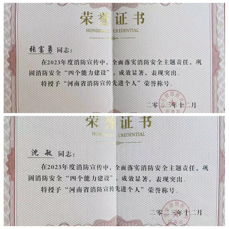 2023年,球友会官方网站全面落实消防安全主体责任,着力加强消防安全“四个能力”建设,成效显著,表现突出,被安全健康教育网河南站授予“2023年度消防宣传先进单位”荣誉称号,保卫处处长张富勇、消防科科长沈敏被评为“河南省消防宣传先进个人”。