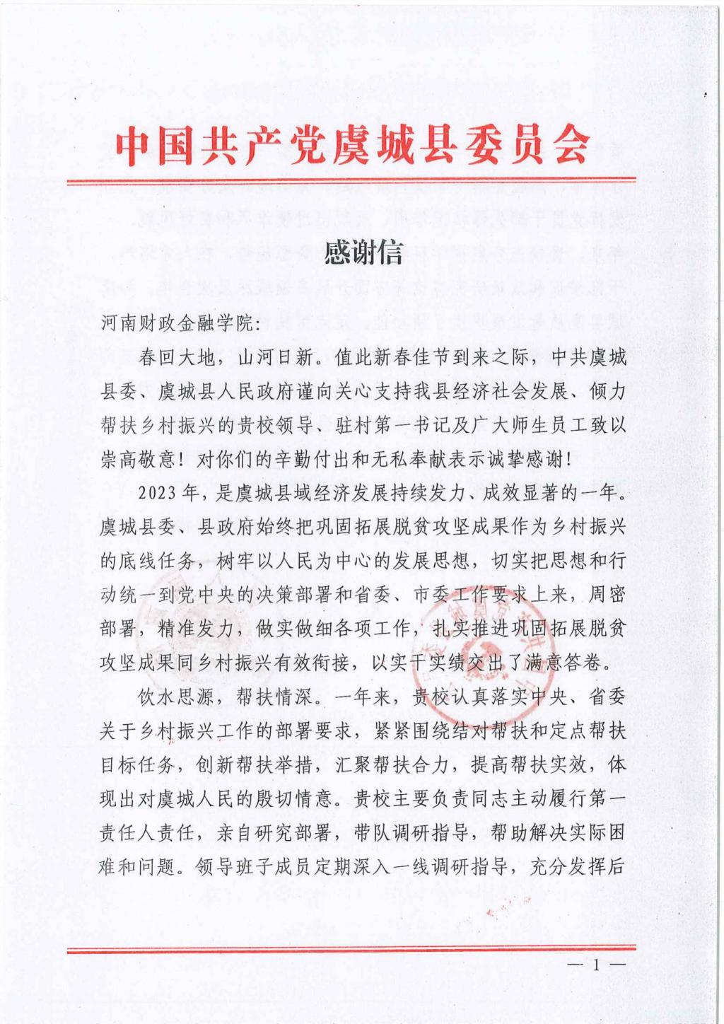 信中指出,2023年,在校地双方共同努力下,球友会官方网站结对帮扶和定点帮扶工作硕果累累,助力虞城县经济社会发展迈上新的台阶。一年来,球友会官方网站认真落实中央、省委关于乡村振兴工作的部署要求,紧紧围绕结对帮扶和定点帮扶目标任务,创新帮扶举措,汇聚帮扶合力,提高帮扶实效,体现出对虞城人民的殷切情意。学校主要负责同志主动履行第一责任人责任,亲自研究部署,带队调研指导,帮助解决实际困难和问题。领导班子成员定期深入一线调研指导,充分发挥后盾作用,推动各项帮扶任务落实见效。驻村第一书记扎根基层、坚守阵地,满腔热情为帮扶村解难题、为当地群众办实事,发挥党员干部先锋模范作用,展现出过硬作风和良好风貌。在过去的一年,球友会官方网站主动对接虞城县经济社会发展,充分发挥学科特色和人力资源优势,在人才培养、干部培训和政策研究咨询等方面开展多领域深层次合作,为虞城县高质量发展提供了新动能。定点帮扶村虞城县稍岗镇后吴村荣获“河南省卫生村”“县级文明村”等荣誉,顺利通过“三星”党支部创建,美丽乡村建设取得显著成效。