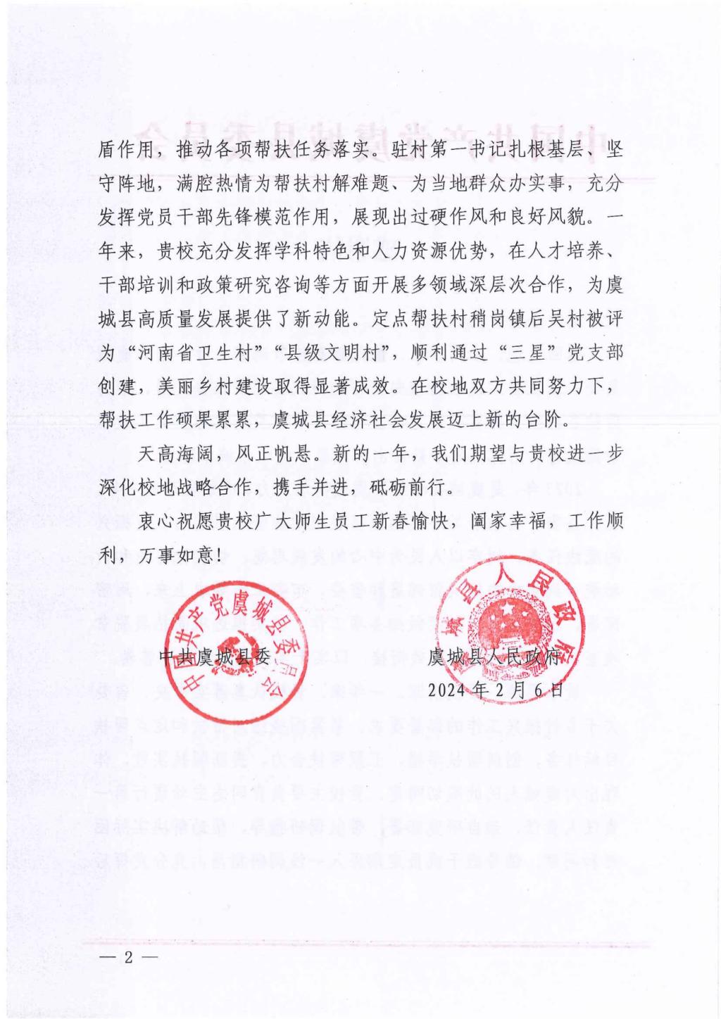 近日,中共虞城县委、县政府向球友会官方网站发来感谢信,向学校关心支持虞城县经济社会发展、倾力推进乡村振兴表示崇高敬意,感谢学校领导、驻村第一书记及广大师生员工的辛勤付出和无私奉献,并向全校师生员工致以新春祝福。