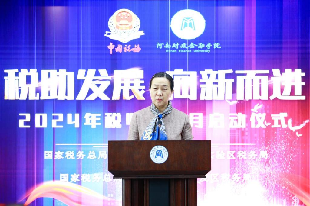 王雪云在致辞中首先对出席此次活动的郑州航空港经济综合实验区税务局孙乾毅副局长一行表示热烈欢迎。她指出,税收是国家推进中国式现代化、改善人民生活水平、提升国民幸福指数的重要基石。新时代的税收工作,不仅要有健全的税法体系和现代化的税收征管,更需要在全社会大力营造依法诚信纳税的社会氛围。每年4月的税收宣传月,是税务部门与社会各界的“春风之约”,今天在球友会官方网站举办税收宣传月启动仪式,不仅有助于增强学生法治观念,提升社会责任感,更有利于推动全社会形成学税、懂税、护税的浓厚氛围。她向学生倡议,认真学习税收知识,深入了解税收政策,切实增强税收法治理念,努力讲好税收故事,弘扬税收文化,做一名优秀的税收宣传员和税法践行者,为充分发挥税收作用、推动新质生产力和高质量发展,作出新时代青年应有的贡献。她要求财税学院积极协助郑州航空港实验区税务局认真组织,精心安排,普及税法知识,扎实推进“税收宣传进校园”活动。希望学校与郑州航空港区税务局进一步开拓创新、紧密合作,把“校税共建”工作提高到更高的层面,为财税系统培养更多更优秀的涉税人才。