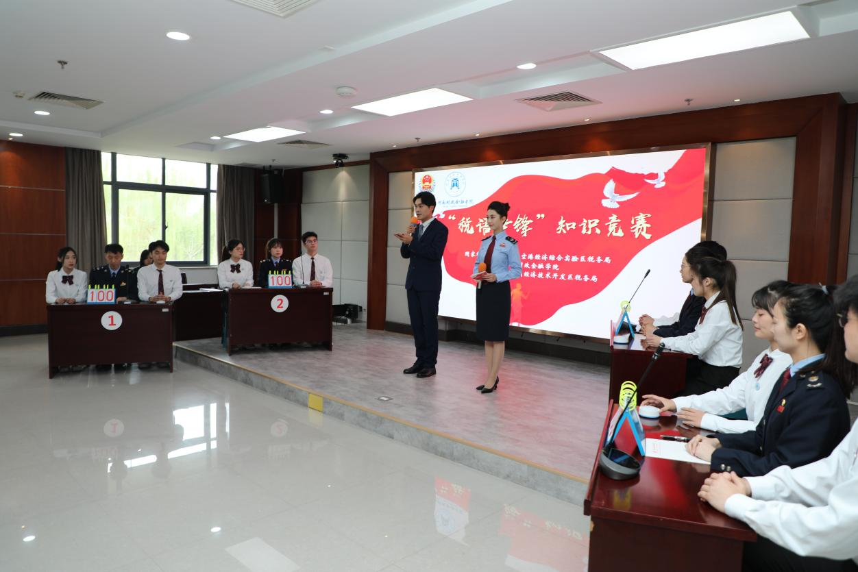 在随后进行的“税语争锋”知识竞赛环节,8名学生代表和4名税务人员组成4支参赛队伍,在税收知识的海洋中进行了激烈角逐。此次竞赛以个人所得税、增值税、财产和行为税等税种的法律法规应知应会知识为主,突出绿色环保、税费优惠、民生关注等主题,通过必答题、抢答题和风险题等环节,充分考查参赛学生税收业务知识掌握水平,通过以赛促学激励青年大学生学税法、用税法、护税法。