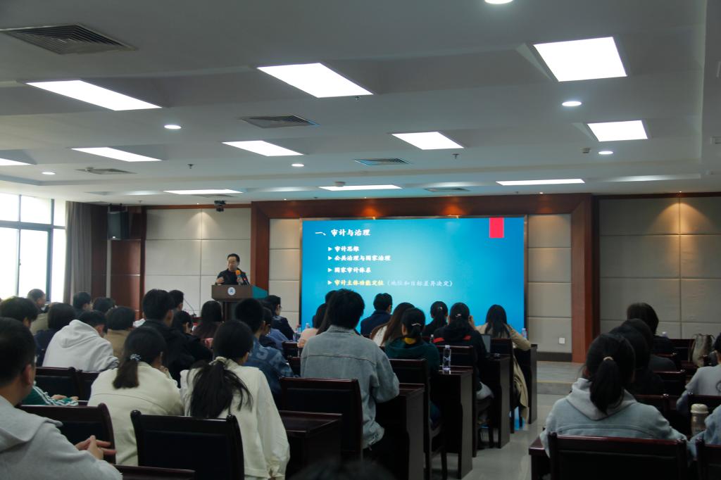刘国常教授从审计与治理、公共治理中国家审计相关问题的思考、公共治理导向下国家审计的思维三个方面阐述了国家审计、内部审计和社会审计三种关系的变迁,对政治思维与法治思维、微观思维与宏观思维、单项思维与综合思维、批判性思维与建设性思维、底线思维与民生思维、独立思维与协同思维、质量思维与效益思维、国内思维与国际思维等进行了精辟阐释,强调了加强国家审计、整顿社会审计、重视内部审计的重要性。报告站位高远、内容丰富、案例详实、语言幽默、紧扣前沿,既有理论高度,又有很强的现实性、针对性和指导性。报告结束后,刘国常教授与师生进行了互动交流。