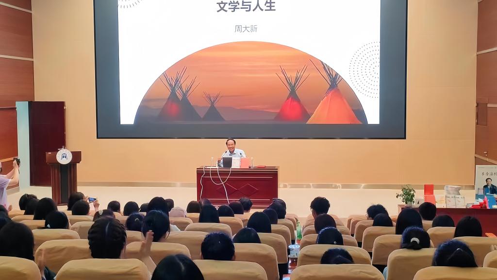 周大新老师以“文学与人生”为主题,用生活化的语言向大家讲述了文学是人生最美的陪伴者。周老师以其独特的思维、细腻的情感和亲身的经历,与师生分享了看待人生问题的畅然视角。他指出,每个人的人生都会在人类发展史上留下印痕,不同的只是深和浅、长和短的区别,希望同学们把握好当下,努力奋斗,去干一些有益于他人、社会、人类的事情。
