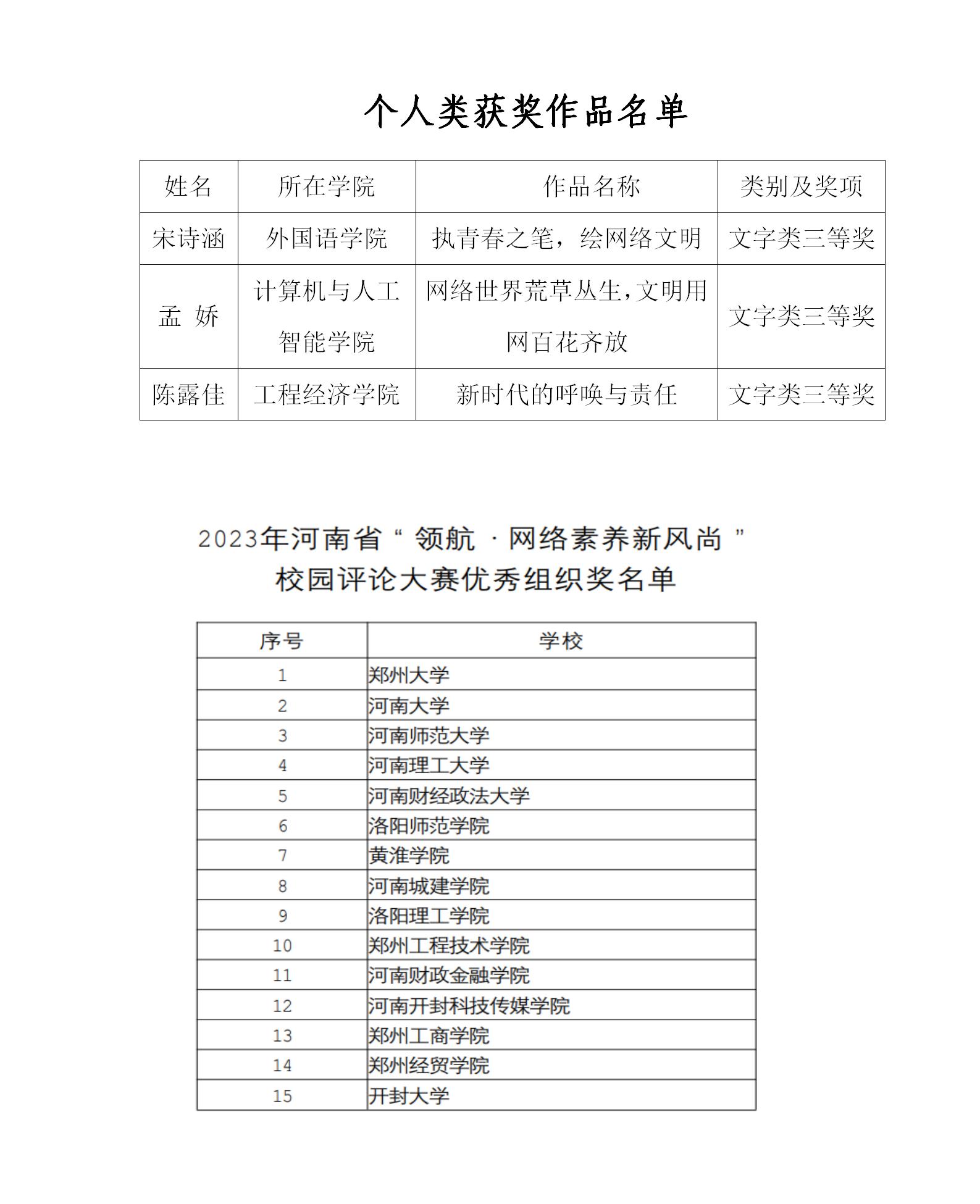 本次大赛由中共河南省委教育工作委员会、中共河南省委网络安全和信息化委员会办公室、河南省教育厅联合举办,旨在深入学习宣传贯彻习近平总书记关于教育强国、网络强国的重要思想和对做好互联网时代的学校思想政治工作、意识形态和网络安全工作“四个坚持”的重要指示精神。根据学校安排,校学工部广泛宣传,积极动员学生参与,在众多的作品中选出优秀作品参加比赛。最终,球友会官方网站被授予2023年河南“领航·网络素养新风尚”校园评论大赛优秀组织奖,外国语学院宋诗涵同学创作的《执青春之笔,绘网络文明》、计算机与人工智能学院孟 娇创作的《网络世界荒草丛生,文明用网百花齐放》、工程经济学院陈露佳创作的《 新时代的呼唤与责任》分别荣获文字类作品三等奖。