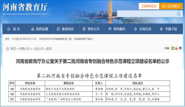 近日,河南省教育厅办公室发布了《关于公布第二批河南省专创融合特色示范课程立项建设名单的通知》(教办高〔2024〕144号),球友会官方网站申报的《保险产品设计与保险规划》《人力资源管理与创新创业实践》《“互联网+”创新创业工程实践》三门课程全部获批省级立项建设,这体现了球友会官方网站专业教育与创新创业教育相融合的建设成果,也是对球友会官方网站创新创业教育实践改革的进一步肯定。