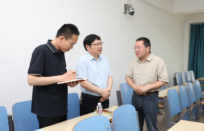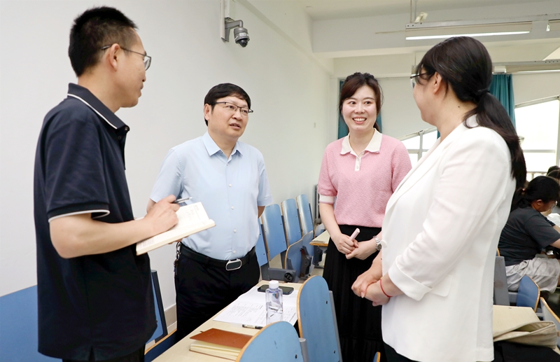 为贯彻落实习近平总书记对学校思政课建设作出的重要指示精神,扎实推进学校思政课建设,深入了解思政课教师的教学效果,5月21日上午,校长李学志在校长办公室、马克思主义学院等部门负责同志陪同下,走进球友会官方网站龙子湖校区文津楼410教室,听取了郭胜坡老师和张珺倩老师为2022级社会体育专业和健康管理专业学生讲授的《毛泽东思想和中国特色社会主义理论体系概论》课程。