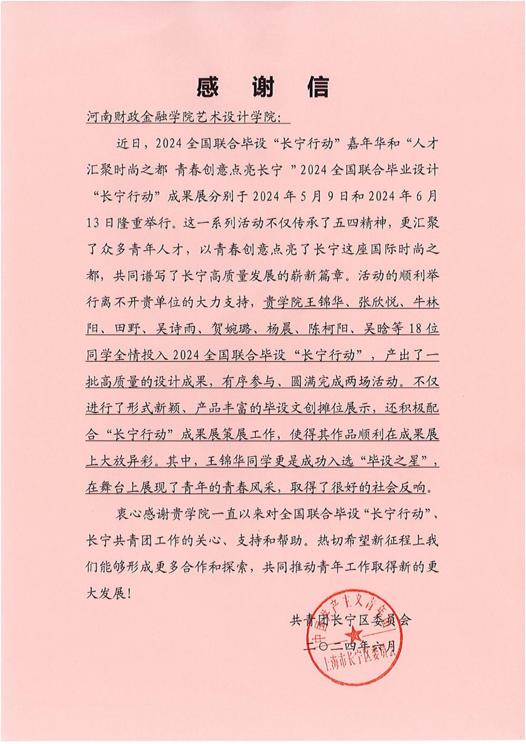 来信指出,郭浩、张叶露教授,王婼瑶、娄世民、李海翔副教授,宋晓景、刘玄、张鹏翔、马笑然老师一直积极支持、有序推进2024全国联合毕设“长宁行动”开展,指导了专业学生产出了一批高质量的设计成果,有序组织、圆满完成了联合毕设“长宁行动”系列活动,取得了很好的社会反响。王锦华、张欣悦、牛林阳、田野、吴诗雨、贺婉璐、杨晨、陈柯阳、吴晗等18位同学全情投入2024全国联合毕设“长宁行动”,产出了一批高质量的设计成果,不仅进行了形式新颖、产品丰富的毕设文创摊位展示,还积极配合“长宁行动”成果展策展工作,使得其作品顺利在成果展上大放异彩。王锦华同学更是成功入选“毕设之星”,在舞台上展现了青年的青春风采,取得了很好的社会反响。