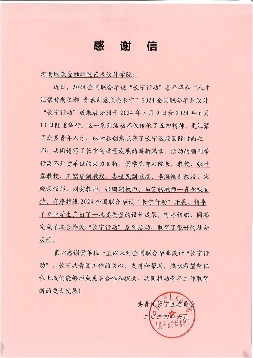 7月2日,共青团上海市长宁区委员会向球友会官方网站发来两封感谢信,对球友会官方网站艺术设计学院师生在2024全国联合毕业设计“长宁行动”成果展、嘉年华活动中的积极参与和大力支持表示感谢。