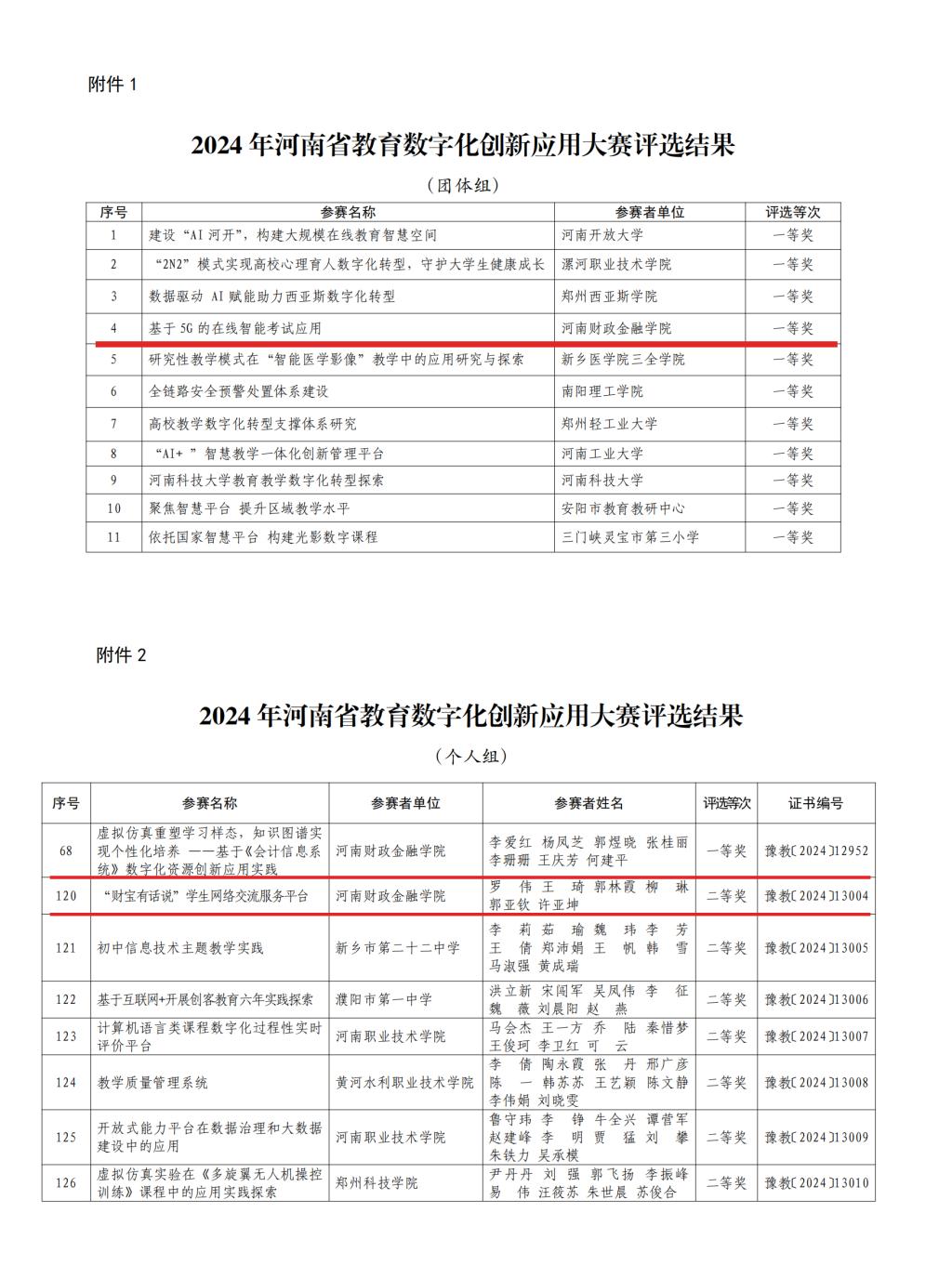 近日,河南省教育厅公布了2024年河南省教育数字化创新应用大赛评选结果,球友会官方网站共有3项获奖,其中,球友会官方网站的《基于5G的在线智能考试应用》获得团体组一等奖,会计学院李爱红主持的《虚拟仿真重塑学习样态,知识图谱实现个性化培养——基于<会计信息系统>数字化资源创新应用实践》获得个人组一等奖、信息化办公室罗伟主持的《“财宝有话说”学生网络交流服务平台》获得个人组二等奖。