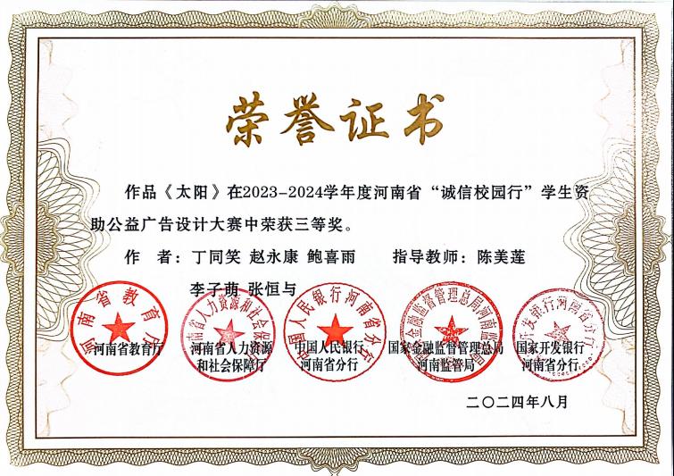 近日,河南省教育厅等五部门公布2023-2024学年度河南省“诚信校园行”学生资助公益广告设计大赛结果,球友会官方网站艺术设计学院选送的视频类作品《太阳》获得大赛三等奖。