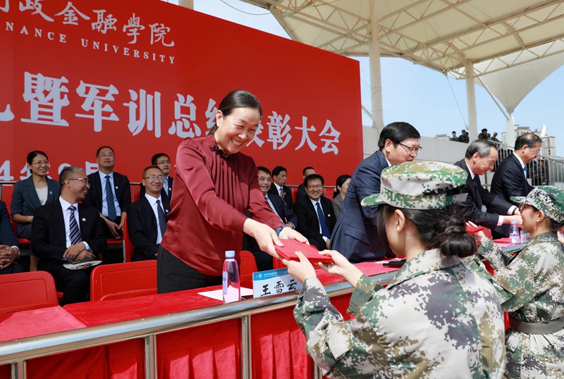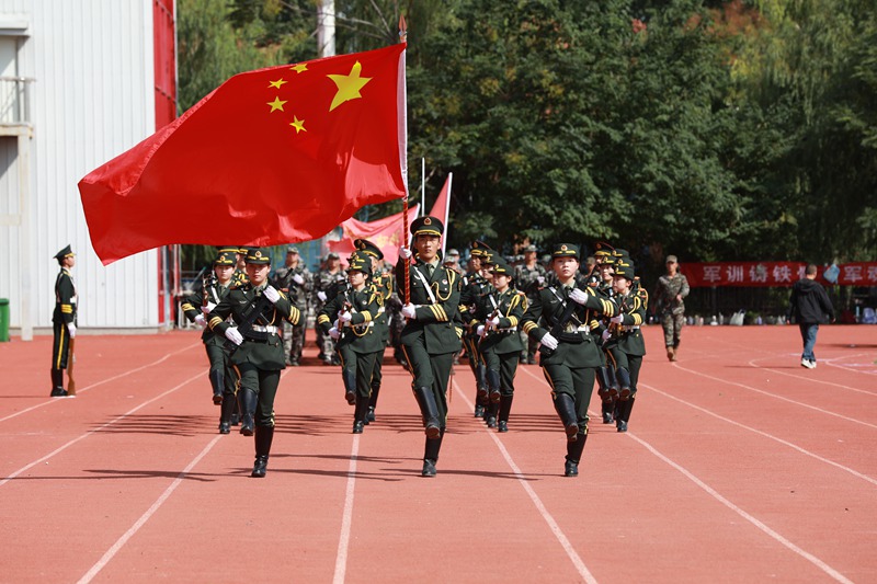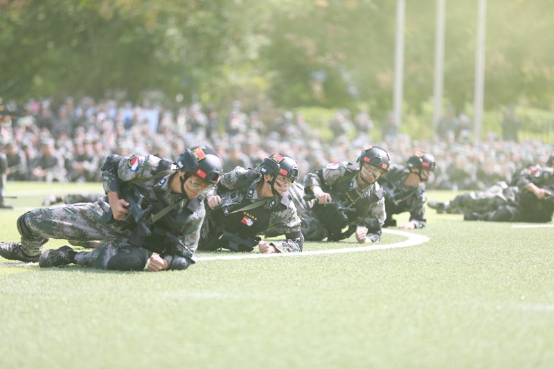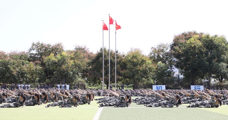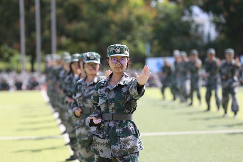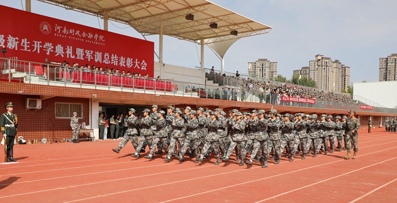 大会在雄壮的国歌声中拉开帷幕。伴随着“标兵就位”“分列式开始”号令的发出,国旗护卫队入场,全体2024级新同学军训汇报表演正式开始,由各学院组成的分列式方阵,整齐划一、口号响亮,迈着整齐的步伐,昂首挺胸正步走过主席台,铿锵有力的步伐、响彻云霄的口号,充分展示了财金学子昂扬向上的精神面貌。随后,擒敌拳方阵、防爆队形方阵、女子匕首操方阵、战术方阵分别进行了汇报表演,一招一式尽显英姿飒爽,为在场师生呈现了一场智慧与勇气、策略与速度的较量,汇报表演精彩纷呈、士气高昂,集中展现了军训成果,赢得了全场师生们的阵阵掌声。