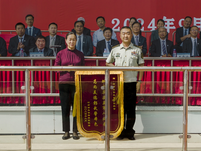 王雪云代表学校向承训部队赠送锦旗,向全体教官的辛苦付出表示由衷感谢。