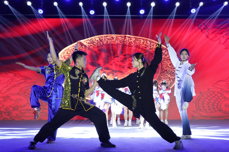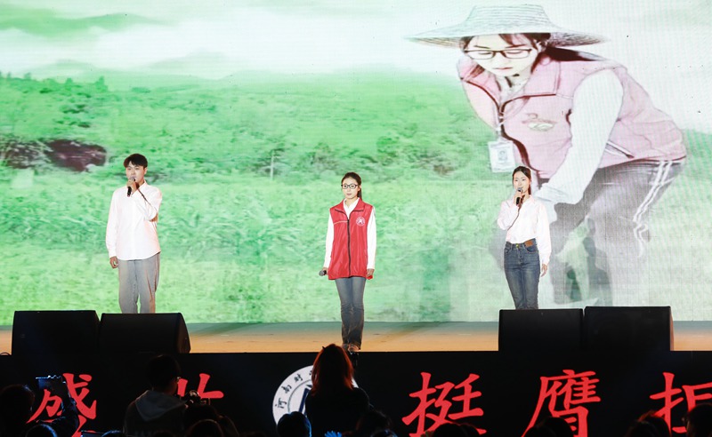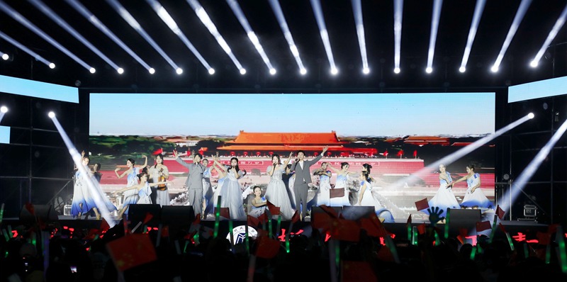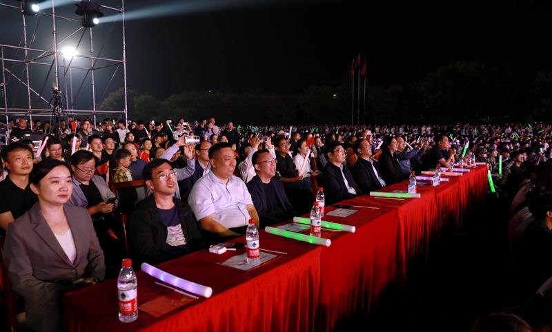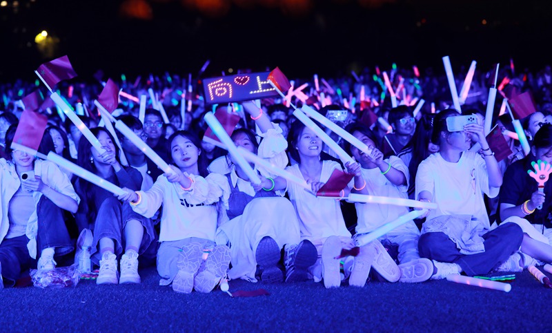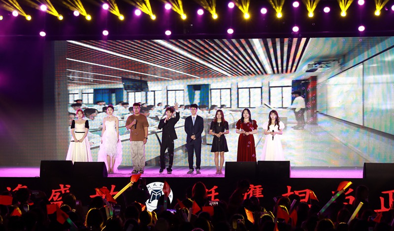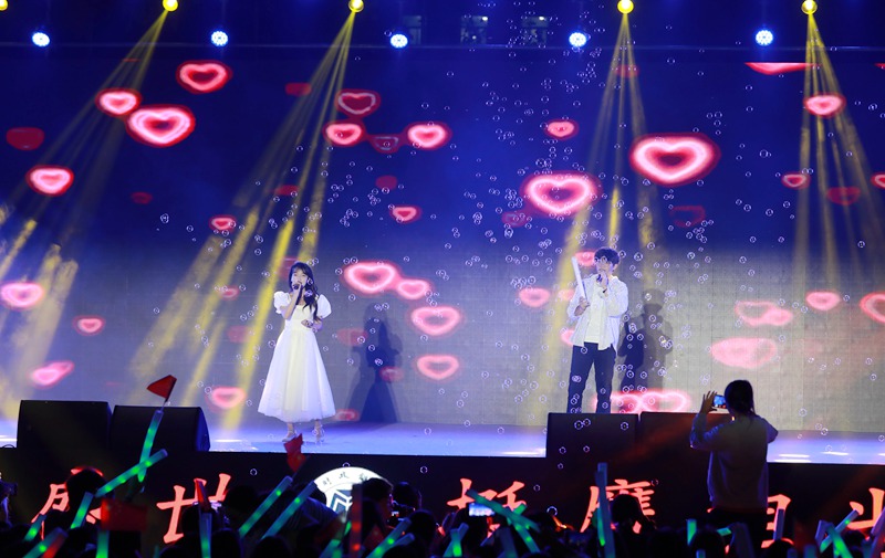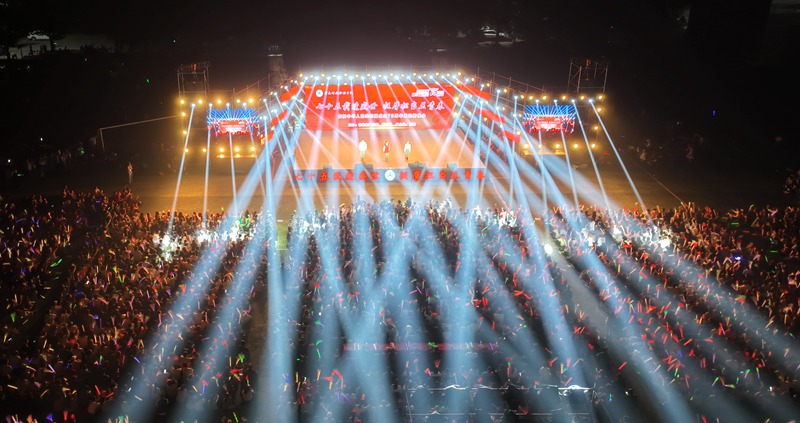 晚会现场,灯光灿烂,气氛热烈欢腾,节目精彩纷呈。饱含着理解、包容和成长的青春校园心理剧《最美宿舍》,师生们源自生活的倾情演绎,走进同学们的心灵深处;傣族舞《傣舞绽新蕾》,演员们踏着月光的涓涓细流,优美温婉;歌曲《灯火里的中国》,来自音乐学院的老师们深情表达了对祖国的美好祝福以及对未来的欣然向往;情景剧《以你为镜》,同学们用真挚的感情、生动演绎“时代楷模”黄文秀的感人事迹,深深打动了每个人的心,让爱与希望传颂弘扬。《武术啦啦操》《街舞》,同学们矫健的身姿、坚定的眼神,展现了当代青年的风采和担当。《海阔天空》《全是爱》等一首首时代之歌,观众们手中的荧光棒随着音乐摇摆,点燃了现场热情。“我和我的祖国,一刻也不能分割。无论我走到哪里,都流出一首赞歌。”最后,全体演职人员和全场师生同唱《我和我的祖国》《有我》,用嘹亮的歌声诉说对祖国的无限深情和祝福,将本场晚会推向了高潮。