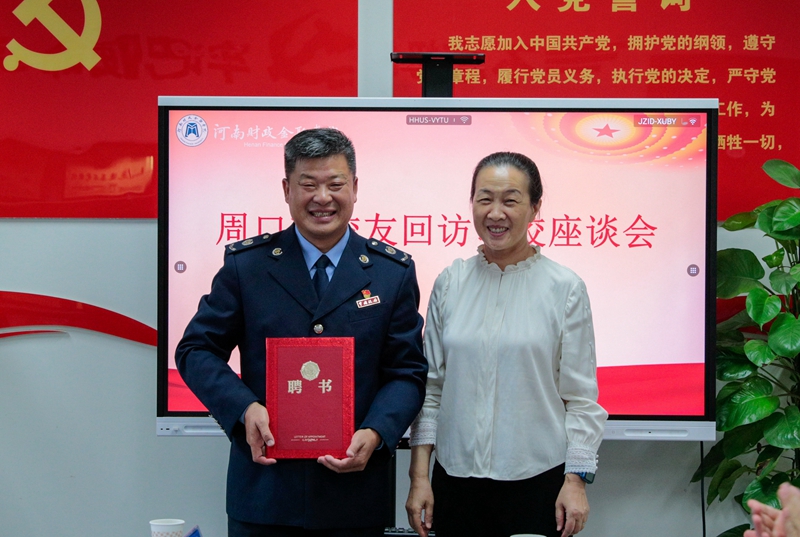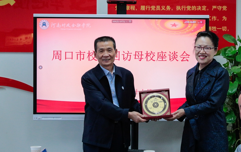 王雪云对周口校友代表回访母校表示热烈欢迎,对校友们长期以来关注、关心、支持母校发展表示感谢。她与校友们一起深情回顾了学校发展历程,向校友们介绍了学校近年来办学成就和未来发展规划。她表示,学校的历史是由包含校友在内的历届师生共同创造,学校的辉煌是由一代又一代校友共同铸就,校友是学校最闪亮的名片,校友的发展与成长是学校办学成效最重要的标志,也是母校最引以为傲、最重要的成绩。韩宇南是27万余名校友中的杰出代表,他扎根基层,为乡村振兴事业做出了突出贡献。这是他个人的荣耀,也是税务人的骄傲,更是母校的自豪。全校师生都要学习韩宇南校友扎根基层、无私奉献、迎难而上、开拓创新的精神,为建设特色鲜明、国内有影响的应用型财经类本科高校而奋勇前行。