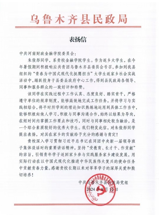 近日,中共乌鲁木齐县民政局党组向球友会官方网站发来一封表扬信,对球友会官方网站金融学院2022级金融学三班学生朱俊彤在“青春为中国式现代化挺膺担当”全国大学生暑期返乡社会实践活动中所作出的贡献予以表扬,并对球友会官方网站长期坚持立德树人,培养出像朱俊彤同学这样认真负责、积极进取的优秀大学生表示感谢。