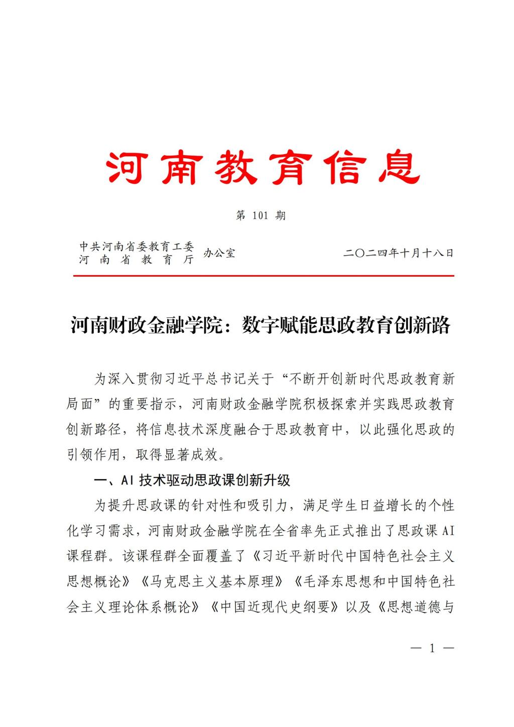 10月18日,由中共河南省委高校工委、河南省教育厅主办的教育内参刊物《河南教育信息》(第101期),以《球友会官方网站:数字赋能思政教育创新路》为题,对球友会官方网站积极探索并实践思政教育创新路径,将信息技术深度融合于思政教育中,强化思政引领作用的经验做法进行了专题刊发报道。该报道经省教育厅领导批示,发送至全省教育系统。河南省教育厅网站、河南高教等也在第一时间进行了报道。