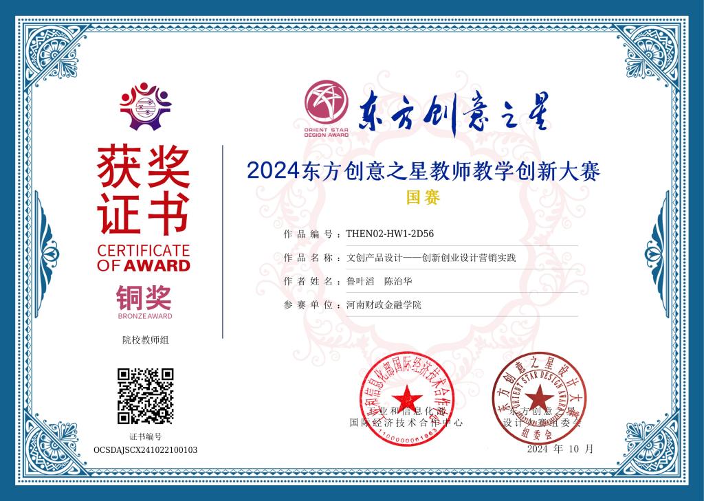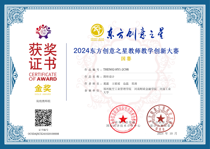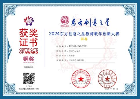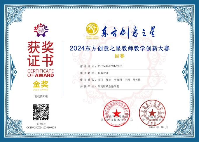 东方创意之星教师教学创新大赛是由工信部国际经济技术合作中心批复举办的工业设计领域竞赛,连续被纳入《普通高校教师教学发展指数》(2022版、2023版)高校教师教学竞赛目录。本届大赛共分为27个省赛区,采用“校赛、省赛、国赛”三级赛制,经过层层评审,来自全国各省赛区的96家单位,共计126位代表参加了线下答辩,最终决出金奖96项。球友会官方网站艺术设计学院高飞主持的《包装设计》课程团队、王婼瑶参与的《图形设计》著作团队,最终分别荣获了国赛课程与教学赛道、论文与著作赛道金奖;王婼瑶“中原崛起,风华正茂”作品获艺术与设计赛道铜奖,鲁叶滔主持的《文创产品设计——创新创业设计营销实践》课程团队、陈治华主持的《文创产品设计》课程分别获得课程与教学赛道铜奖。