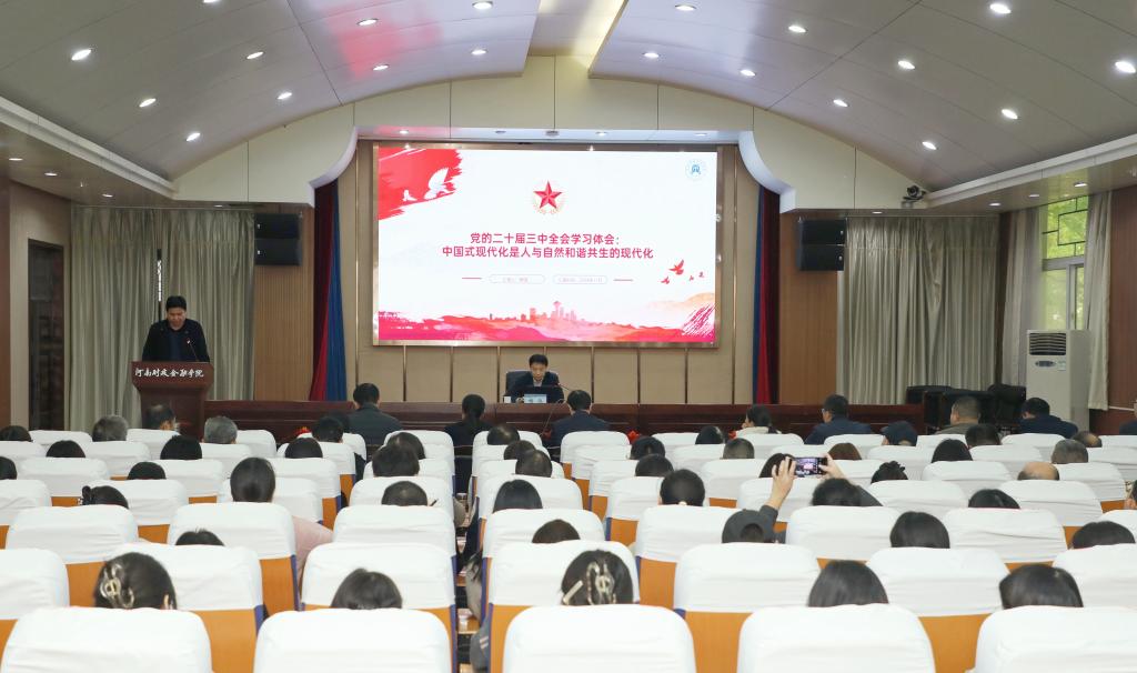 为深入学习贯彻党的二十届三中全会精神,11月5日下午,副校长杨波在龙子湖校区行政楼一楼会议室讲授专题党课。科研处、发展规划处、招生就业处、外事处、招标采购办公室、工商管理学院、环境经济学院、国际教育学院(韦伯国际学院)、图书馆、综合档案馆、期刊中心、中原发展研究院财政所等近200名师生党员分校区、分会场参加党课活动。