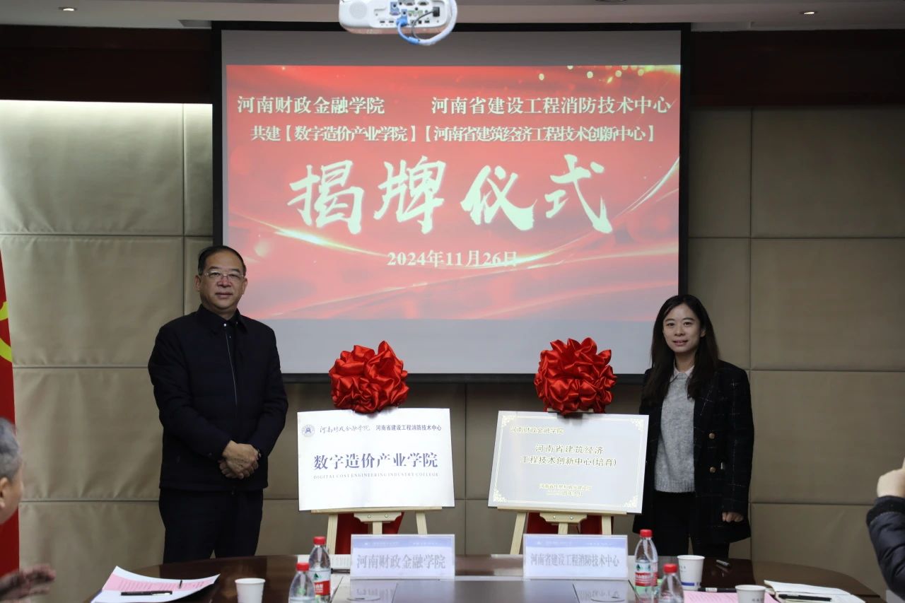 副校长杨伯坚和省住房和城乡建设厅科技与标准处处长姬媛媛共同为“数字造价产业学院”“河南省建筑经济工程技术创新中心”揭牌