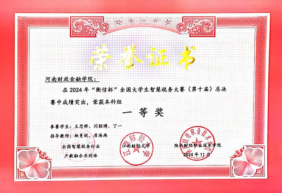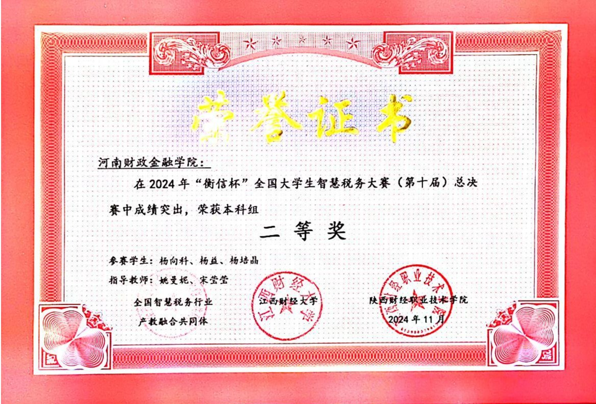 11月23日—24日,由中国税务学会、教育部《中国税制》课程虚拟教研室、江西省税务学会指导,全国智慧税务行业产教融合共同体、江西财经大学、陕西财经职业技术学院主办,浙江衡信教育科技有限公司技术支持的2024年衡信杯全国大学生智慧税务大赛(第十届)总决赛在江西财经大学举行。球友会官方网站由财政税务学院姚曼妮、席海燕和宋莹莹老师指导,2022级税收学专业王思铧、闫颖博、丁一、杨向科、杨益和杨培晶组成的两支代表队,以全国第3名和第25名的成绩分别荣获大赛一等奖和二等奖。