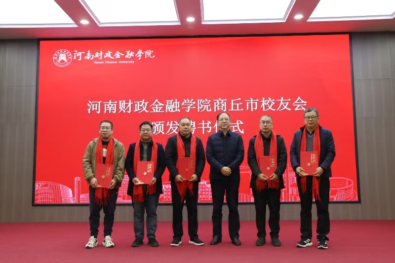 副校长杨伯坚为商丘市校友会授旗、赠送纪念品并为第一届理事会组成人员颁发聘书