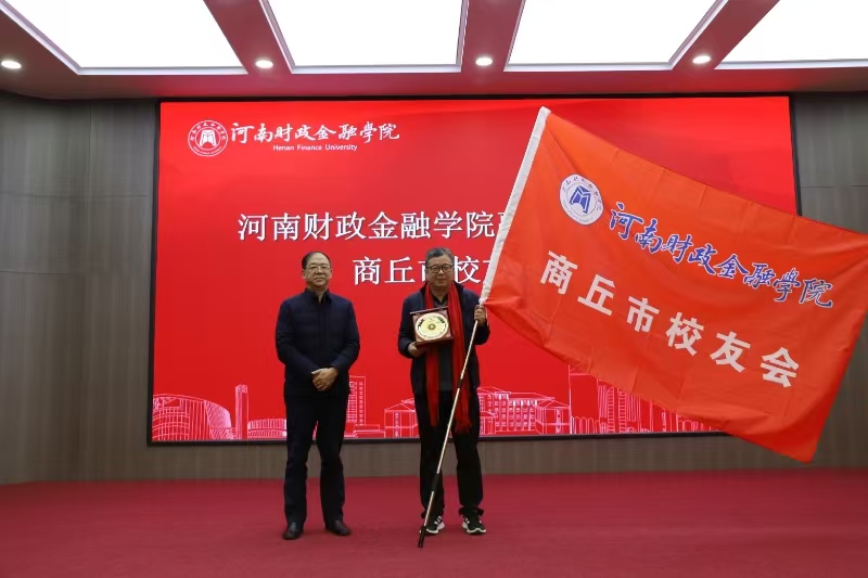 在与会校友的共同见证下,杨伯坚为商丘市校友会授旗、赠送纪念品并为第一届理事会组成人员颁发聘书。