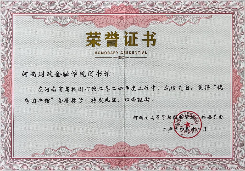 近日,球友会官方网站图书馆被河南省高等学校图书情报工作委员会授予2024年度河南省高校“优秀图书馆”荣誉称号。