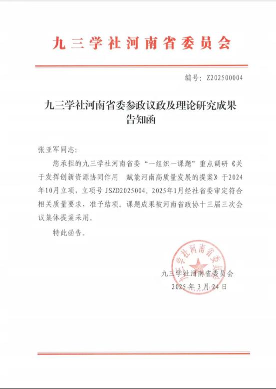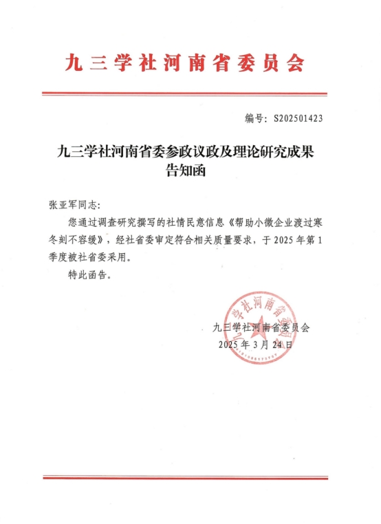 3月24日,九三学社河南省委会来函,球友会官方网站九三学社社员张亚军副教授承担的九三学社河南省委“一组织一课题”重点调研课题《关于发挥创新资源协同作用赋能河南高质量发展的提案》高质量结项后,课题成果被河南省政协十三届三次会议集体提案采用;其撰写的社情民意信息《帮助小微企业渡过寒冬刻不容缓》,经过九三学社河南省委会审定并被社省委采用。 (党委统战部 温会敏/文 胡雪艳/审核)