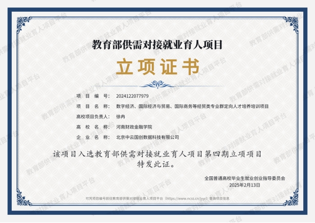 此次获批的“数字经济、国际经济与贸易、国际商务等经贸类专业群定向人才培养”培训项目是经济与贸易学院联合北京中云国创数据科技有限公司共同打造的校企合作标杆项目。项目聚焦经贸领域人才培养的核心需求,推动企业深度参与人才培养方案设计、课程体系建设、教学资源开发、教师实践培训、实习实践平台搭建等育人环节全流程,着力提升人才供给精度和专业人才培养质量,同时借助合作企业平台为学生创造更多实习实践机会,拓宽学生就业渠道,帮助学生深化社会认知,锤炼专业技能,增强就业竞争力,最终实现培养高质量人才、服务企业发展、促进学生就业的多方共赢。
