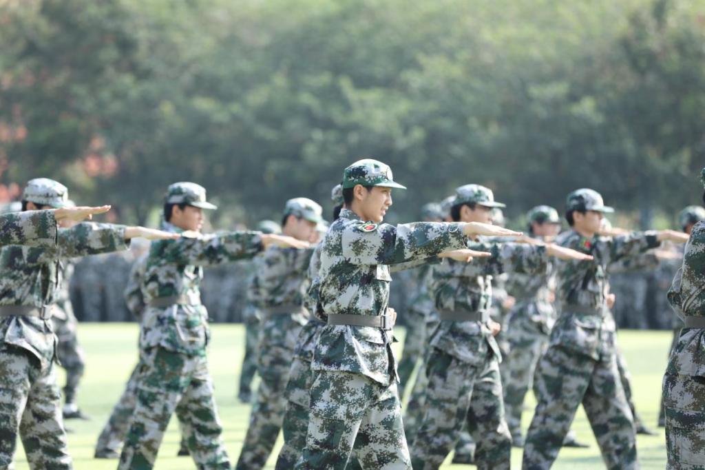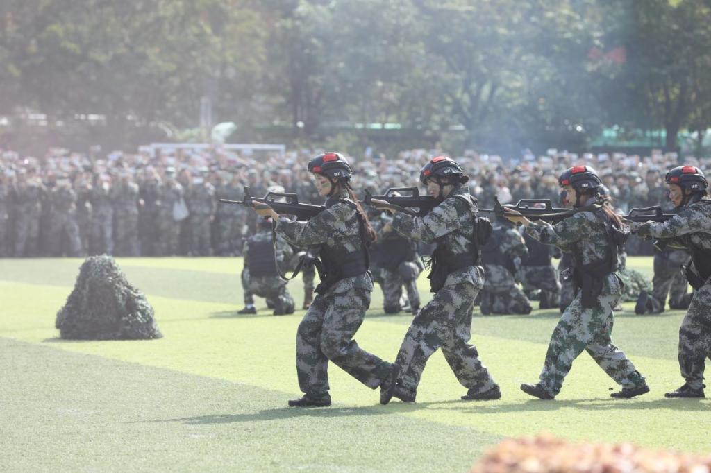 大会在雄壮的国歌声中拉开帷幕。伴随着“标兵——就位”口号,2025级学生代表组成的分列式方阵,在国旗护卫队的带领下,迈着整齐的步伐,昂首挺胸走过主席台,他们步伐铿锵有力,军姿挺拔如松,口号嘹亮震天,展示着财金学子经过军事训练带来的蜕变与成长。随后,三大特色表演方阵接连登场,擒敌拳方阵率先亮相,直拳、勾拳迅猛有力,格挡、摔拿干脆利落;战术对抗方阵上演“实战演练”,生动还原了实战场景;女子花样方阵带来别样惊喜,伴随着歌曲变换阵型,将现场气氛推向高潮。