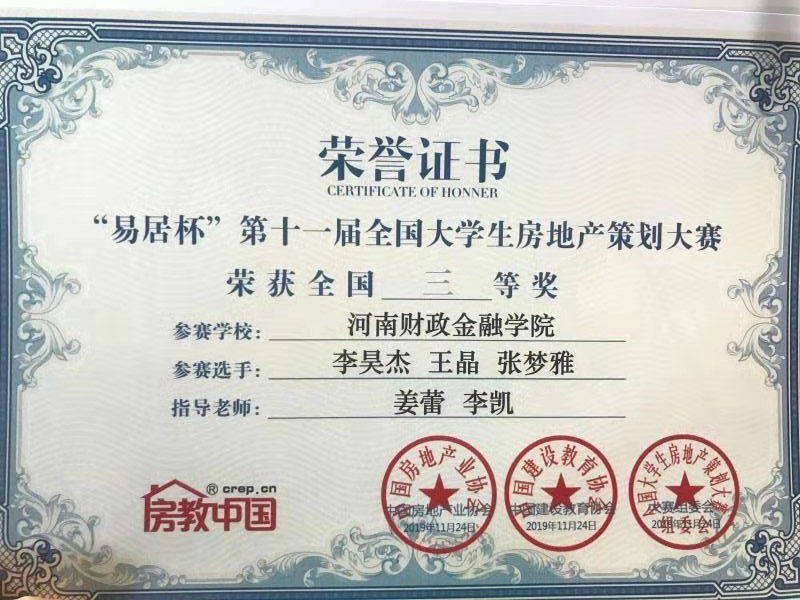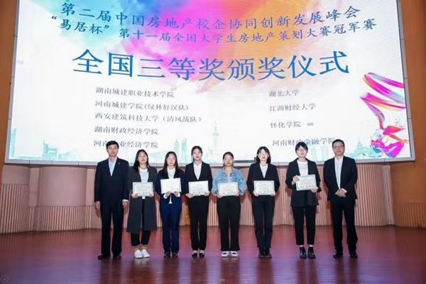 11月24日,由中国房地产业协会指导、中国建设教育协会主办的“易居杯”第十一届全国大学生房地产策划大赛在深圳大学沧海校区举行。球友会官方网站姜蕾、李凯2位教师指导的2017级房地产经营与管理专业张梦雅、王晶、李昊杰3位学生组成的代表队,经过激烈角逐,荣获全国三等奖。