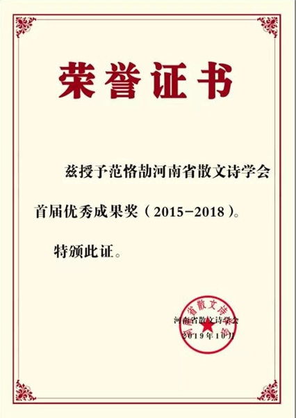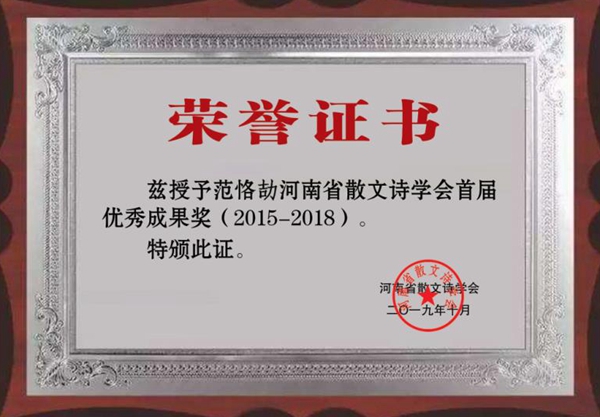 10月29—30日,河南省散文诗学会第九届年会在鹤壁市西顶小镇成功举办。球友会官方网站韦伯学院院长范恪劼教授荣获学会全省首届优秀成果奖(2015——2018)。在颁奖词中,学会高度评价了范恪劼教授在当代散文诗文学批评中的贡献,“范恪劼在进入散文诗诗坛有限的时长中,创作与评论双管齐下,开启了一位知识分子在散文诗深水区中泅游与体察的双重生命历程。他的散文诗批评,以中肯的评骘、诚恳的感悟、到位的理解和深刻的揭示,为包括河南在内的当代散文诗人获得文学价值的确认、人文精神的高标与创作方向的把握,提供了有影响力的支持。作为河南散文诗界有限的批评家之一,范恪劼独立纯正的学术探索、理性智慧的表达风格、紧扣当下的审美观照、严谨治学的学者精神秉承,无疑值得肯定并鼓励。”范恪劼教授长期关注当代文学尤其是散文诗的创作态势,其研究成果得到了各界好评。
