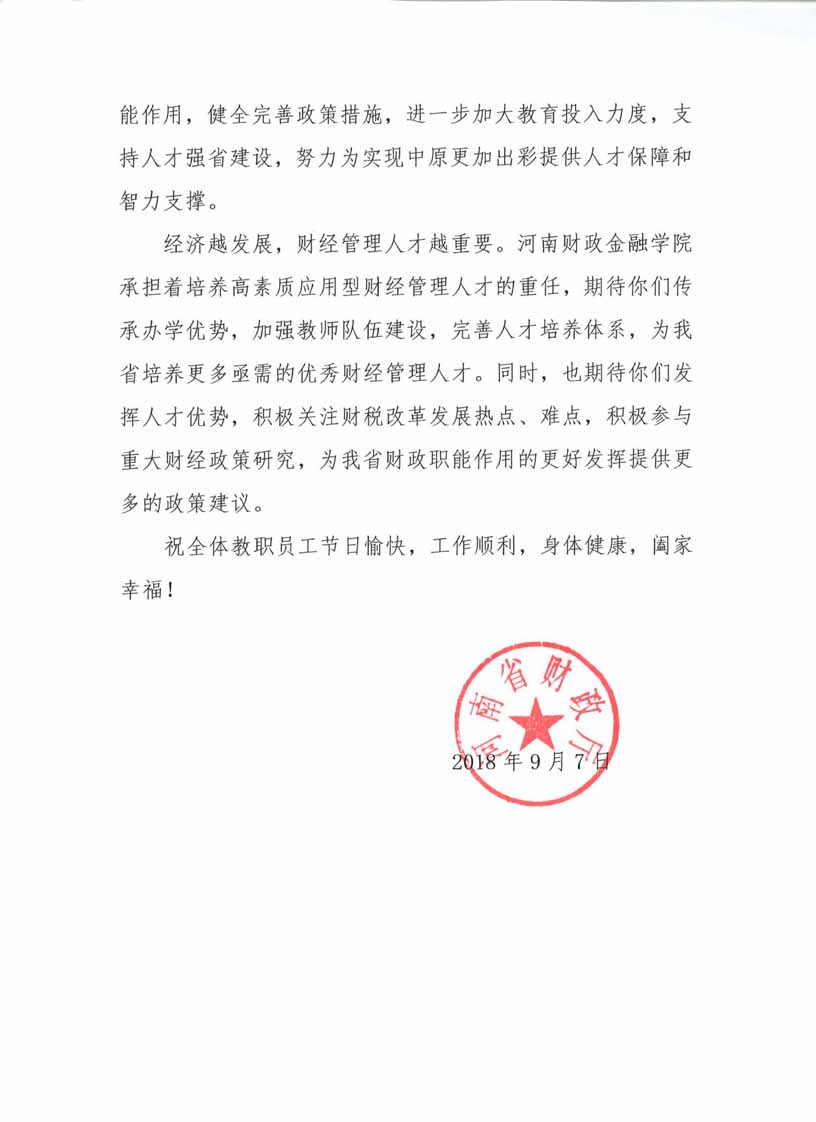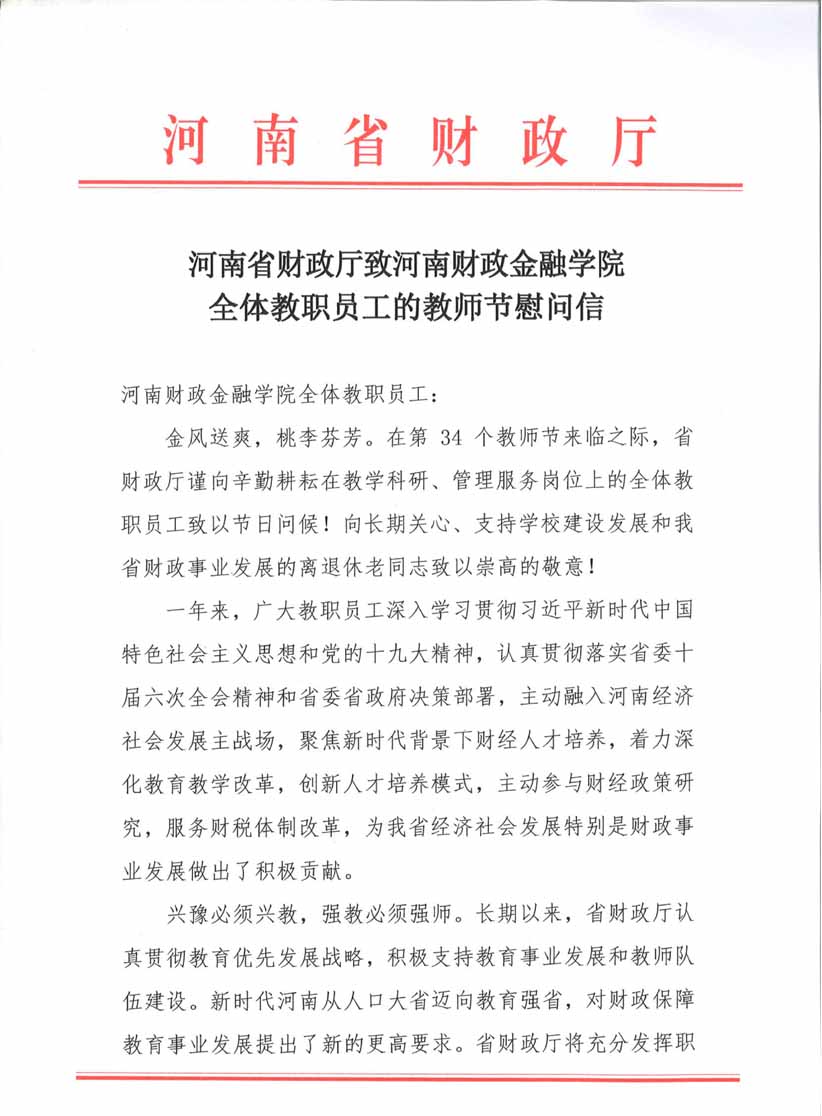 9月7日,学校收到省财政厅慰问信,向球友会官方网站全体教职员工致以节日的问候和崇高的敬意!慰问信全文如下: