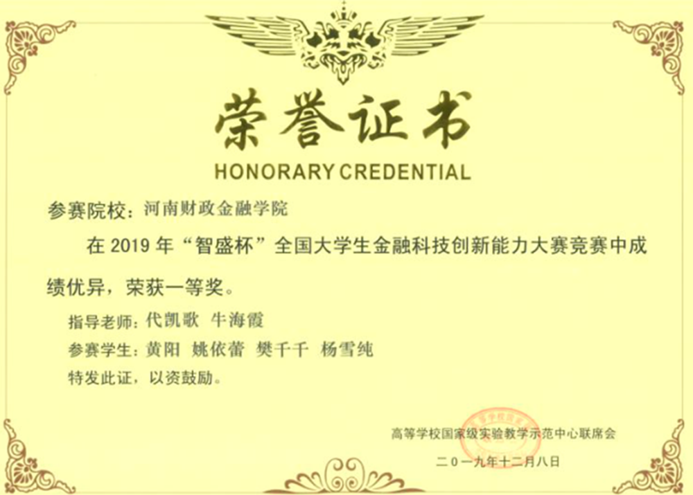 12月7日,“智盛杯”全国大学生金融科技创新能力大赛在广东财经大学举办,来自全国24个省市的59所高校参加此次大赛。球友会官方网站金融学院2017级投资四班黄阳和2017级投资三班杨雪纯、樊千千、姚依蕾四名同学组成的参赛队,经过激烈角逐,最终获得团体一等奖,代凯歌、牛海霞老师获“优秀指导教师”奖。