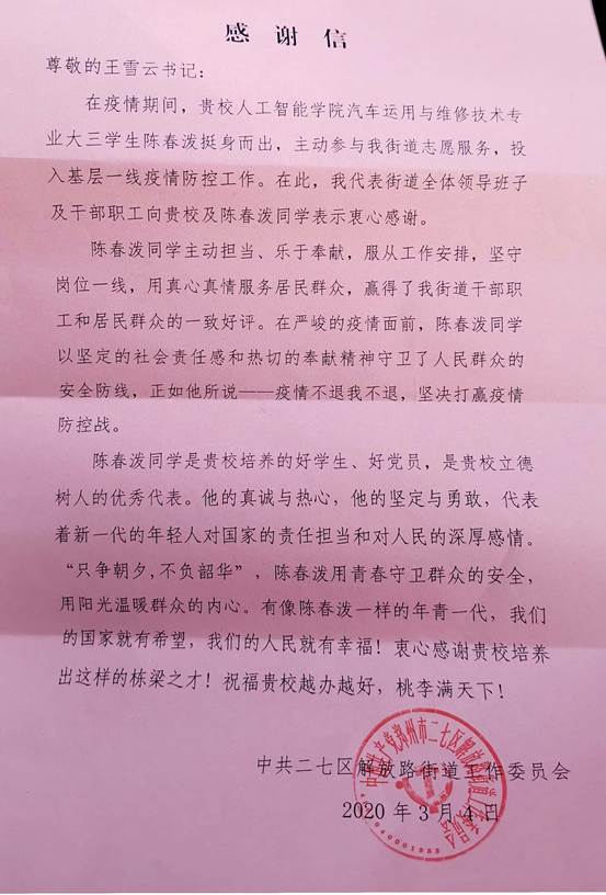 在疫情期间,贵校人工智能学院汽车运用与维修技术专业大三学生陈春泼挺身而出,主动参与我街道志愿服务,投入基层一线疫情防控工作。在此,我代表街道全体领导班子及干部职工向贵校及陈春泼同学表示衷心感谢。