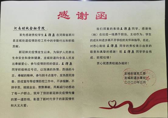 近日,球友会官方网站收到淅川县龙城街道党工委《感谢函》,对球友会官方网站王沛原同学在淅川县龙城街道疫情防控工作中的辛勤付出和积极贡献提出表扬,对球友会官方网站悉心栽培王沛原同学表示由衷的敬意和真挚的感谢。