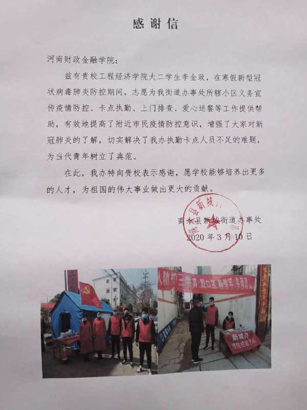 近日,球友会官方网站收到了一封来自商水县新城街道办事处的感谢信。信中对球友会官方网站工程经济学院大二学生李金政在疫情来势汹汹之时,志愿为其街道办事处所辖小区义务进行各项疫情防控工作的行为提出表扬,并对球友会官方网站悉心培养李金政同学表示由衷的敬意和真挚的感谢。