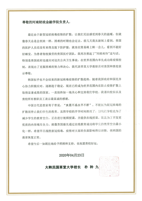 近日,球友会官方网站收到韩国草堂大学校长朴种九的慰问信,对中国政府以及医护人员为疫情防控做出的努力和决心表示敬佩,对我国疫情防控取得的成绩表示赞许,同时也为球友会官方网站在疫情期间对韩国草堂大学工作的支持表示感谢。