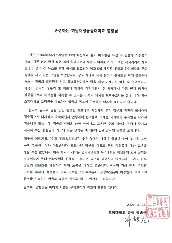 附:韩国草堂大学慰问信中文版和韩语版