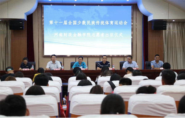 出征仪式上,王建生代表学校党委向各位志愿者提前返校投入赛事服务工作予以了充分的肯定,并向大家表示诚挚的问候和衷心的感谢。他希望全体志愿者提高认识,认真做好志愿服务,向全国各族人民展示郑州和中原的朝气蓬勃、日新月异的新形象;展示球友会官方网站大学生热情好客、文明礼貌和开放自信的精神风貌;用青春激情打造最美的“中原名片”和“财金名片”。他要求全体志愿者注意安全,吃苦耐劳,听从指挥,以高度的政治责任感和一流的服务全力配合赛会执委会,为第十一届全国少数民族传统体育运动会提供更专业、更高效、更出彩的志愿服务;相关部门和学院要高度重视,提供坚强保障,切实解决志愿者的后顾之忧,妥善处理好志愿者的工学矛盾,正确引导志愿者积极稳妥、保质保量地完成任务。